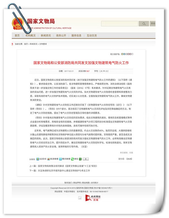 近日,國(guó)家文物局和公安部消防局共同印發(fā)《關(guān)于加強(qiáng)文物建筑電氣防火工作的通知》(以下簡(jiǎn)稱《通知》),要求各級(jí)文物、公安消防部門、各文物建筑管理使用單位,嚴(yán)格按照文物、消防法律法規(guī)和《國(guó)務(wù)院關(guān)于進(jìn)一步加強(qiáng)文物工作的指導(dǎo)意見》(國(guó)發(fā)〔2016〕17號(hào))有關(guān)要求,針對(duì)近期文物建筑電氣火災(zāi)高發(fā)的突出問(wèn)題,進(jìn)一步加強(qiáng)文物建筑電氣火災(zāi)風(fēng)險(xiǎn)評(píng)估,加大文物建筑電氣火災(zāi)隱患檢查督察和排查整改力度,采取有效的電氣火災(zāi)防護(hù)技術(shù)措施,切實(shí)減少火災(zāi)危害,全面加強(qiáng)文物建筑電氣防火工作,確保文物建筑消防安全。